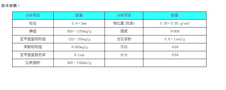 在煤質活性炭中,褐煤活性炭比無煙煤活性炭具有較多的過渡孔隙及較大的平均孔徑,因此能有效地除去水中大分子有機物。一般在水處理中使用的活性炭,其表面積不一定過大,但是應具有較多的過渡孔隙及較大的平均孔徑。日本市埸售一些液相用的活性炭具有以下特性:比表面積為850至1000m2/g,孔隙容積為0.88至1.5ml/g,平均孔隙半徑為40至50A。