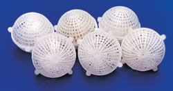 球形懸浮填料,又稱多孔旋轉(zhuǎn)球形懸浮填料,是對(duì)國(guó)內(nèi)處理污水、生物膜法處理技術(shù)采用的多種填料中開(kāi)發(fā)的最新系列產(chǎn)品。 在污水的生化處理中具有全立體結(jié)構(gòu),比表面積大,直接投放,無(wú)須固定,易掛膜,不堵塞。 150z型懸浮球填料內(nèi)芯結(jié)構(gòu)是將塑料圓片壓扣改成雙圈大塑料環(huán),將醛化纖維或滌綸絲壓在環(huán)的環(huán)圈上,使纖維束均勻分布;內(nèi)圈是雪花狀塑料枝條,既能掛膜,又能有效切割氣泡,提高氧的轉(zhuǎn)移速率和利用率。使水氣生物膜得到充分交換,使水中的有機(jī)物得到高效處理。